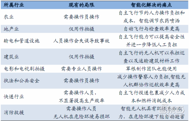 2.美国国会研究服务局在文件中列举了一些无人机商用领域和智能化后的改变,智能化可以在诸多应用领域打开普通无人机目前的很多局限。