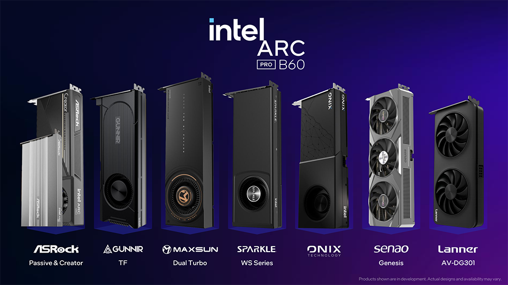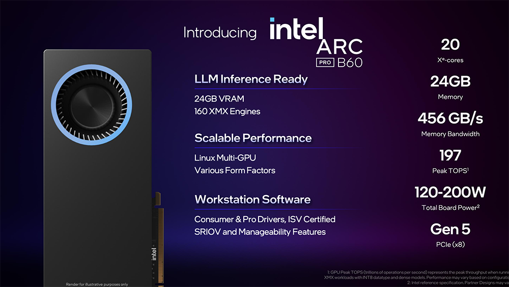 有合作伙伴将提供锐炫Pro B60的单卡双GPU方案,板载显存容量达48GB。