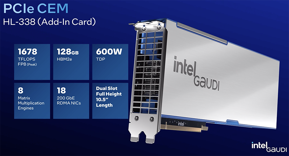 英特尔Gaudi 3 PCIe卡配备128GB HBM2e,FP8精度下AI峰值算力达到1678TFLOPS,支持在现有服务器数据中心环境中进行可扩展的AI推理。