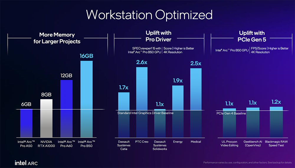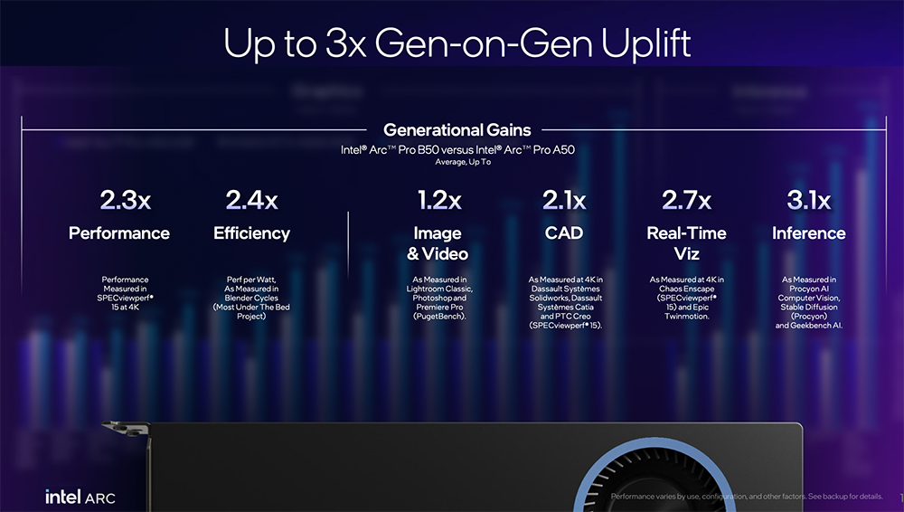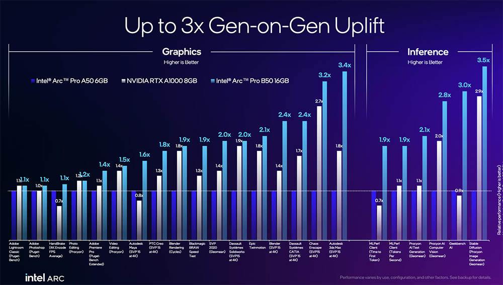 与上一代产品及竞品相比,锐炫Pro B50在图形和AI推理性能上有1.1倍~3.5倍的提升。