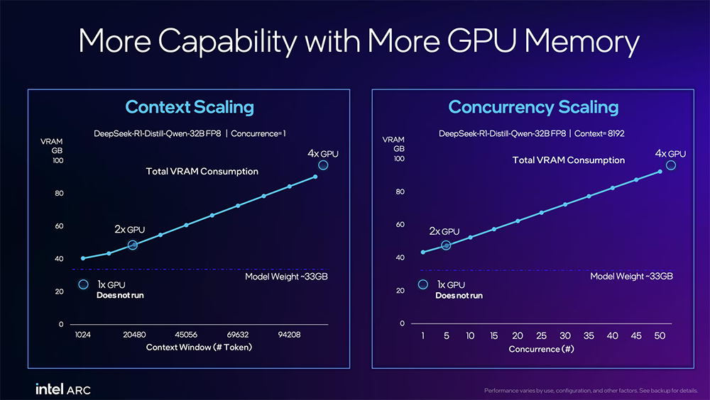通过多卡互连,锐炫Pro B60能够以更大的显存容量,来支撑大模型运行,并在上下文和并发扩展方面展现优势。一张锐炫Pro B60跑不了32B参数量的DeepSeek-R1蒸馏模型,但2张GPU就能支持20k tokens上下文,4张GPU可将上下文窗口扩展到100k以上,足以直接输入一本不太厚的书或论文。