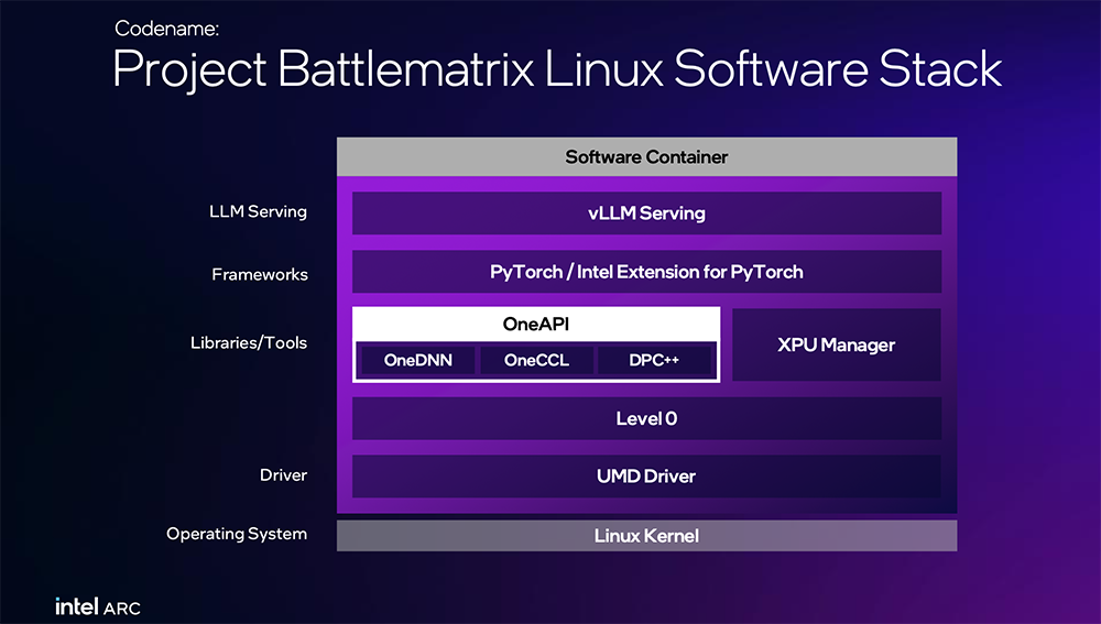 其Project Battlematrix Linux软件栈如下图所示,Linux操作系统位于容器之外,往上是用户层驱动,Level 0是英特尔的底层驱动,再向上是英特尔OneAPI和XPU Manager,上层是英特尔对生态系统的支持。目前该软件栈采用vLLM Serving,未来也将支持SGLang等其他开源软件。英特尔对各层软件进行了完整的验证和优化,并通过容器形式一键交付给客户,以方便部署。