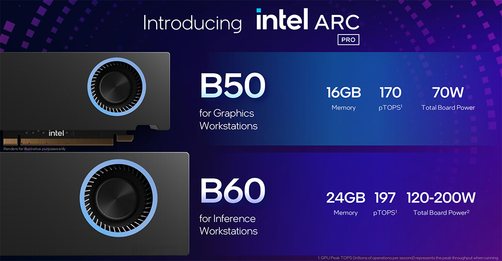 其中,锐炫Pro B60配备24GB显存,AI峰值算力为197TOPS,适用于推理工作站;锐炫Pro B50配备16GB显存,AI峰值算力为170TOPS,适用于图形工作站。