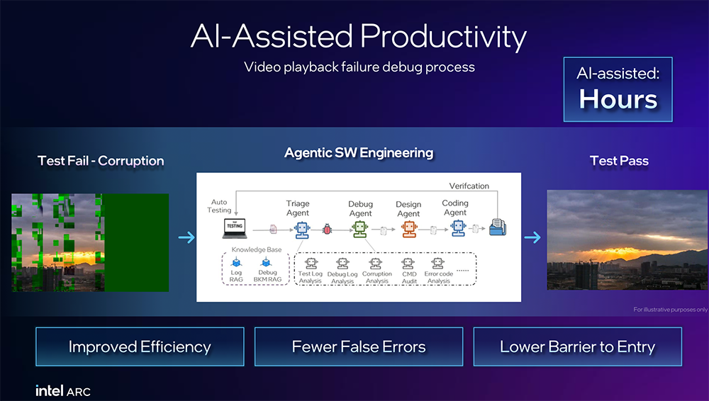 英特尔自己也用锐炫Pro B60来解决问题。在开发酷睿Ultra第二代Lunar Lake产品时,英特尔在VPC解码过程中发现了一个Bug,表现出现花屏现象。这类问题通常非常复杂,可能跨越多个软件层,且代码量巨大。一位经验丰富的工程师通常需要花费数天时间,从数万行log中发现问题,debug找到根源,并提供代码修复方案,然后重新进行测试。