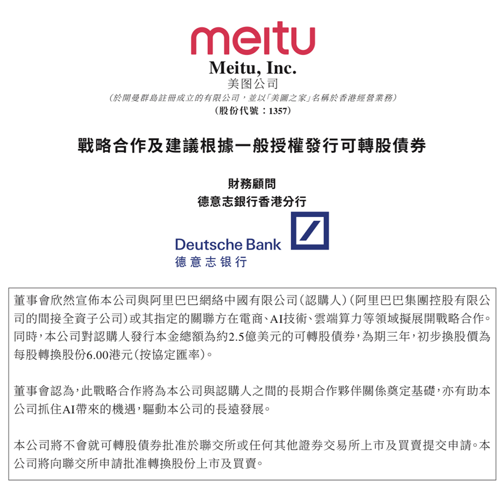 公告显示,阿里巴巴以可转债的形式投资美图,本金总额为2.5亿美元(净筹资约2.496亿美元),为期3年,年利率为1%。