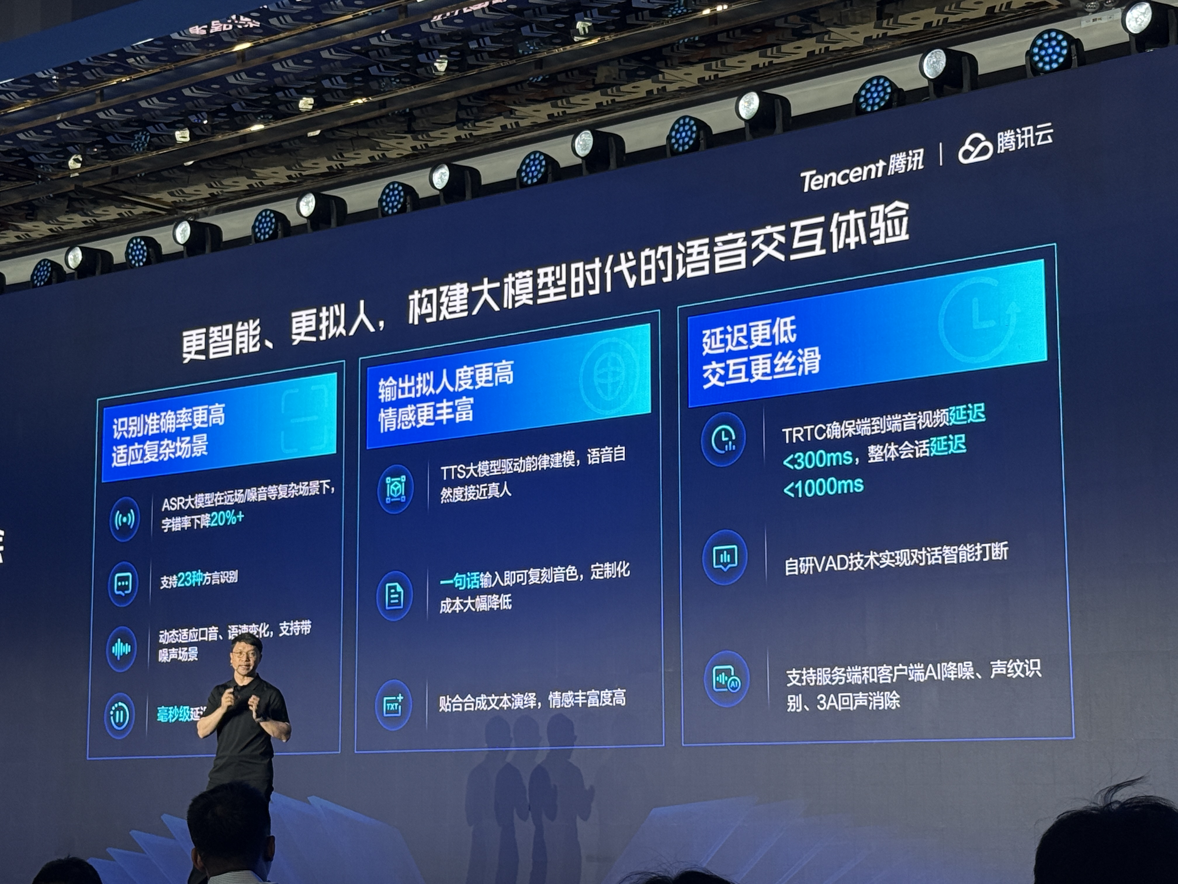 为了实现更智能、更拟人的交互体验,腾讯云将语音识别、输出、实时传输等层面不断优化:ASR大模型识别准确率更高,可适应复杂场景,真正做到让AI听得懂;TTS大模型能够输出拟人度更高、情感更丰富、自然度更接近真人的语音;TRTC确保端到端音视频延迟<300ms,整体会话延迟<1000ms。