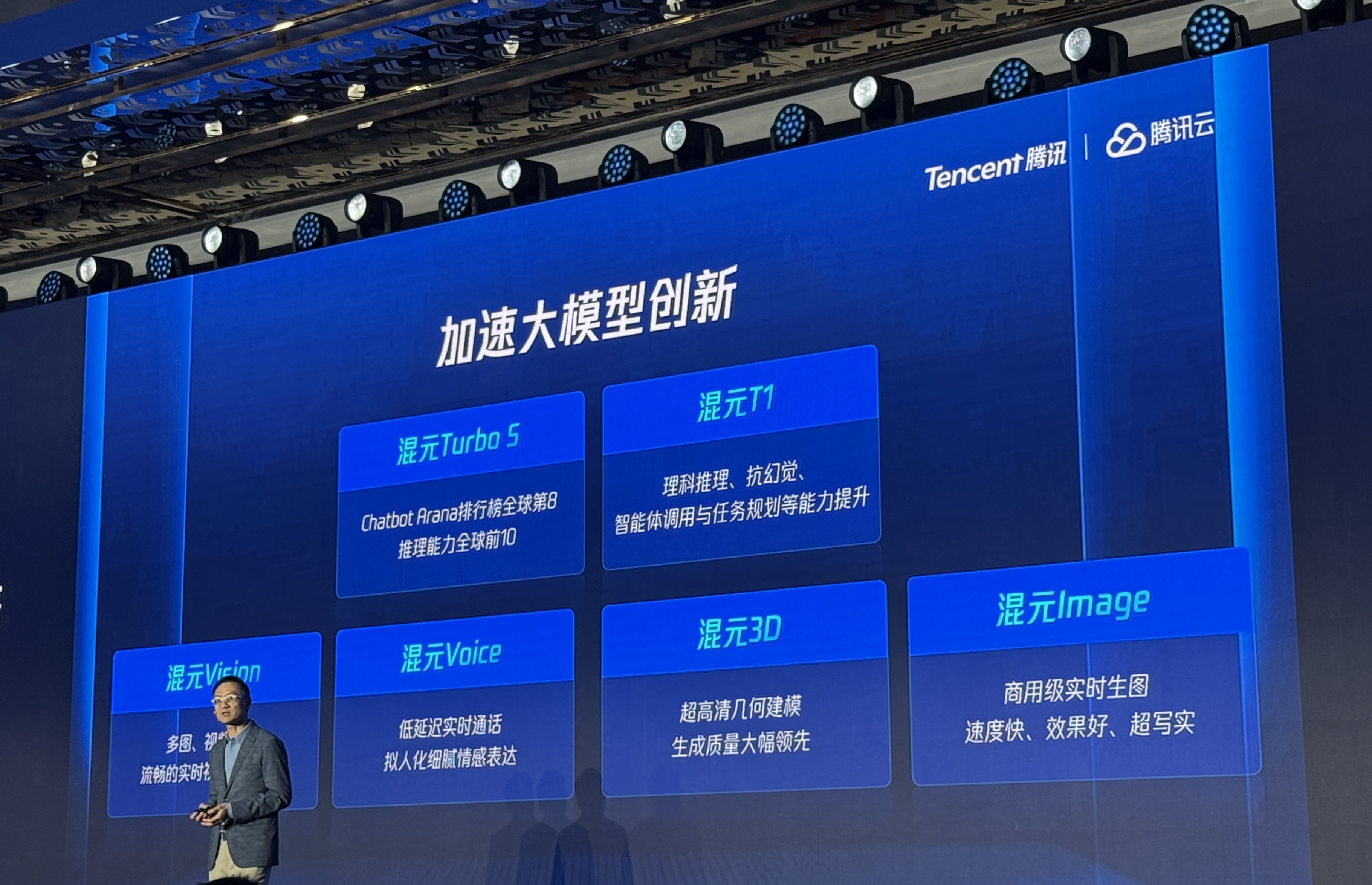 腾讯混元大模型矩阵包括混元Turbo 5、视觉深度推理模型混元T1、多模态模型混元Vision、端到端语音通话模型混元Voice、3D生成模型混元3D、商用级实时生图模型混元Image。