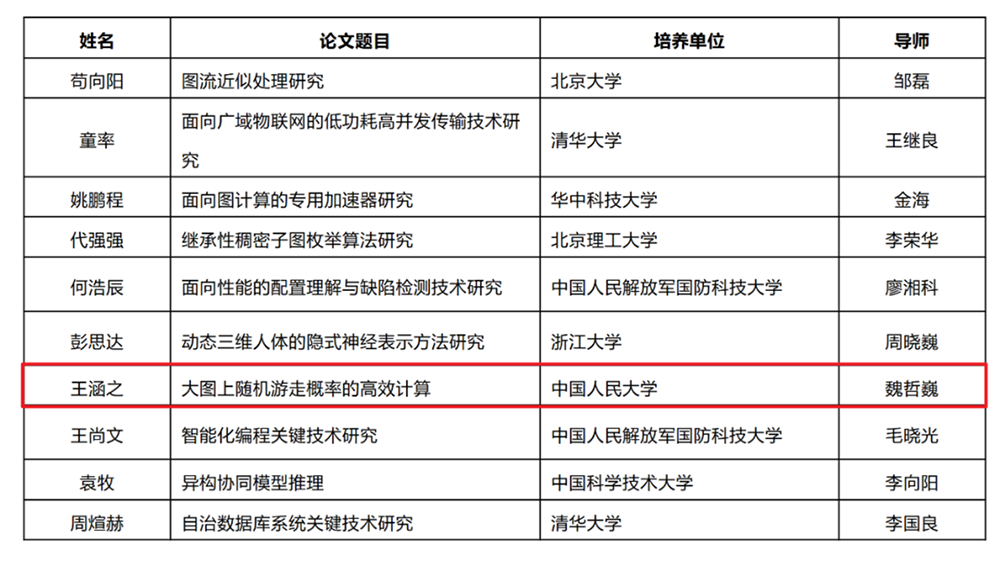 CCF优博(中国计算机学会博士学位论文激励计划)是中国计算机学会自2006年起设立的激励奖项,每年从国内高校计算机学科博士毕业生中评选不超过10名获奖者,以表彰其所做出的优秀成果。王涵之也是2024年CCF优博中唯一一位女生。