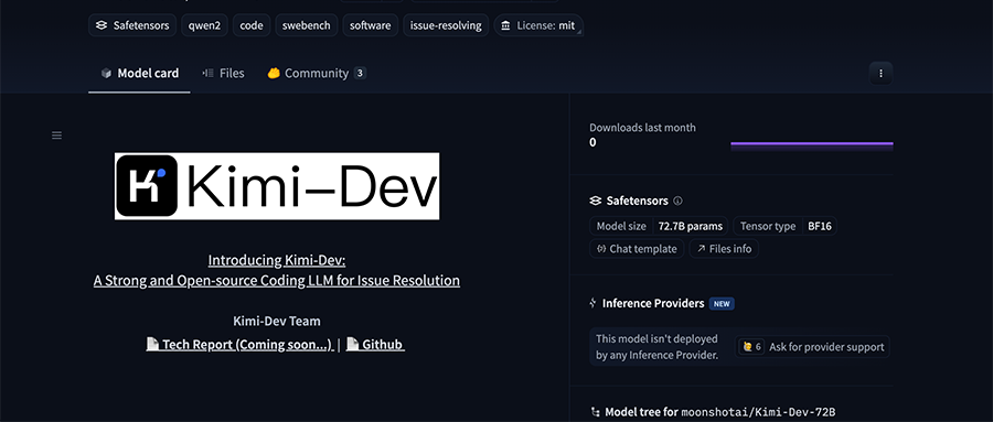 Kimi-Dev-72B现已在Hugging Face和GitHub上提供下载和部署。其发布给社区的关键资源包括模型权重、源代码,技术报告也即将推出。