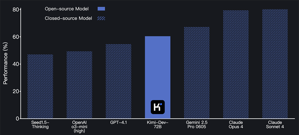 Kimi-Dev-72B在AI软件工程能力基准测试SWE-bench Verified上取得了60.4%的高分,创下开源模型的SOTA成绩。
