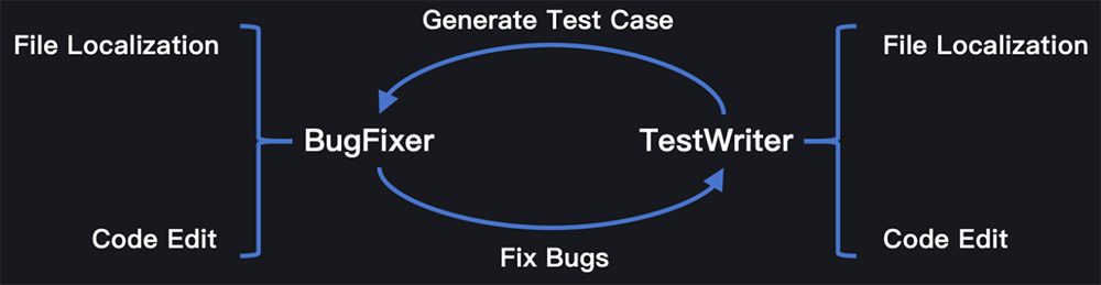 成功修复错误的补丁(patch)应能通过准确反映该错误的单元测试。同时,复现错误的成功测试应引发断言错误,并在将正确的错误修复补丁应用到代码库后通过。这致使BugFixer和TestWriter互补,一个足够强大的编程大语言模型应该在这两个方面都表现出色。