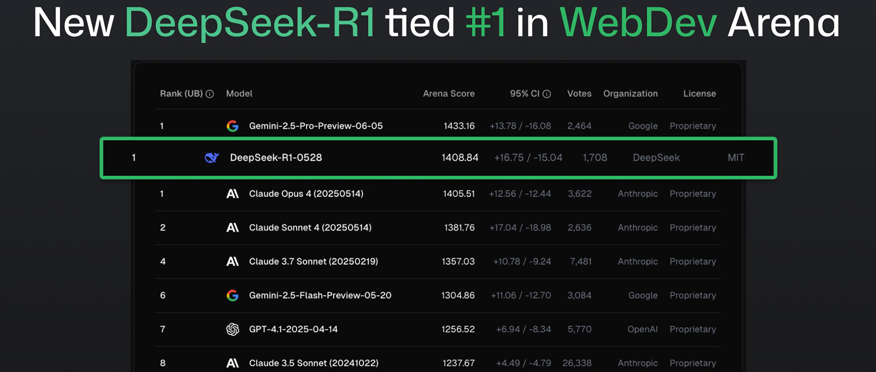 DeepSeek-R1在WebDev Arena上的性能现已追平Claude Opus 4,鉴于Claude长期以来作为编程导向型AI的标杆地位,这是一个值得关注的里程碑,这标志着开源AI迎来了关键时刻。