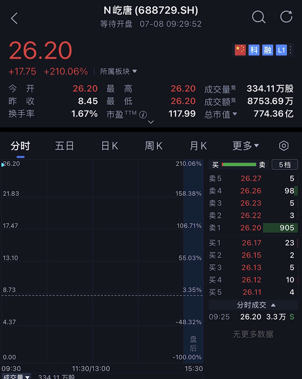 其发行价为8.45元/股,发行市盈率为51.55倍,开盘价为26.20元/股,上涨210.06%,开盘时总市值为774亿元。