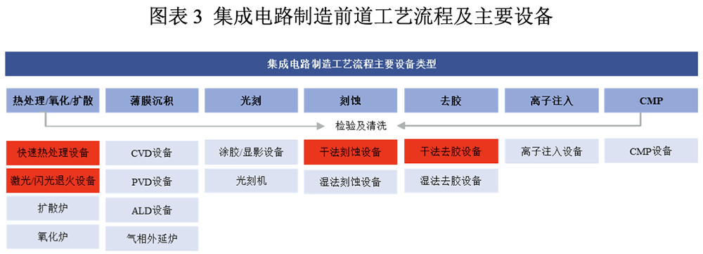 ▲集成电路制造前道工艺流程及主要设备,红色部分为屹唐股份三类专用设备所应用的主要工艺环节与流程