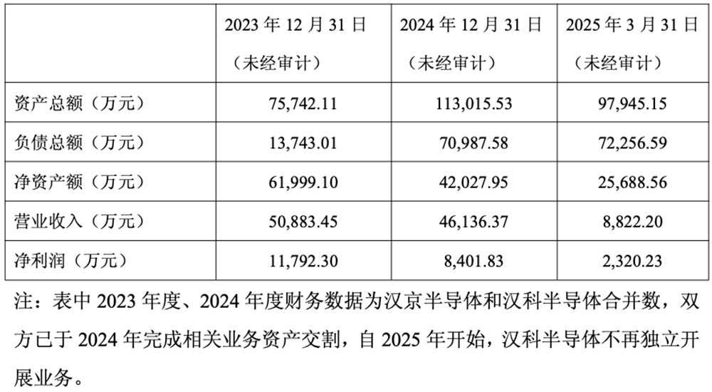 2023年、2204年、2025年1-3月,汉京半导体的主要财务数据如下:
