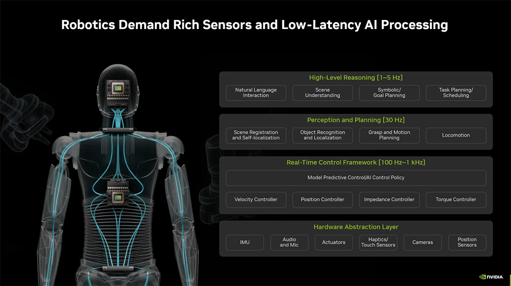 机器人需要搭载丰富的传感器来感知世界,并实现低延时的AI处理。实时控制框架通常在100Hz-1kHz频率上运行,感知与规划通常在30Hz频率上运行,高级推理通常在1-5Hz频率上运行,就像人思考一样,可能会想几秒钟。