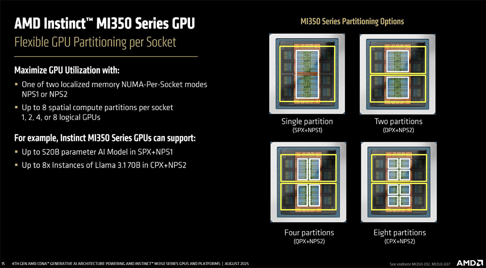 MI350系列可配置为单个或两个NUMA域。除了内存分区选项外,XCD 还可以拆分为多个计算分区。