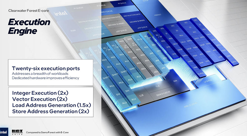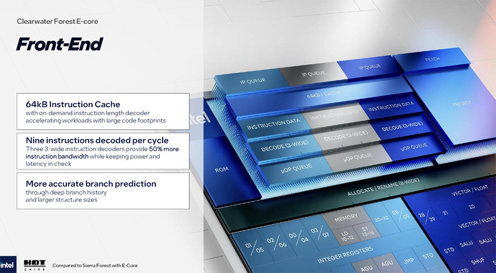 在前端,Clearwater Forest通过3个3-wide指令解码器,将指令宽度提升50%。分支预测器也进一步优化,能提高整体准确性。