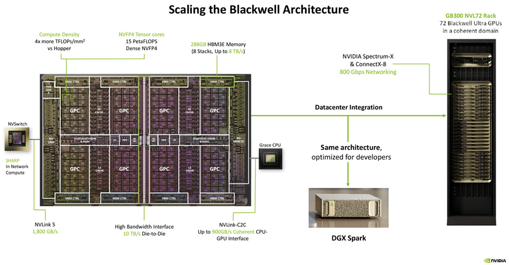 它继承了Blackwell架构的所有主要功能,并提供128GB低功耗LPDDR5x高带宽统一内存,FP32精度下AI性能可达31TFLOPS,FP4精度下性能高达1000TFLOPS,额定TDP为140W。