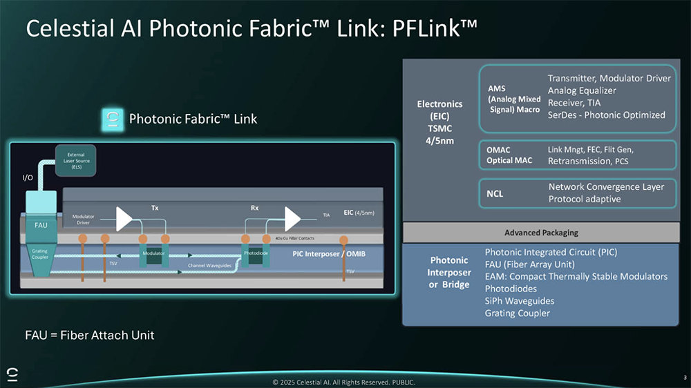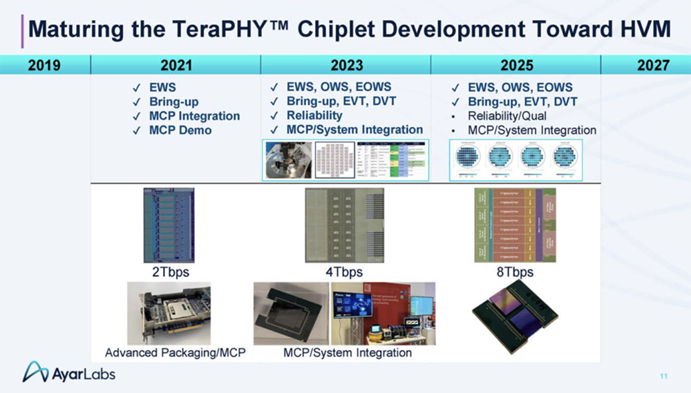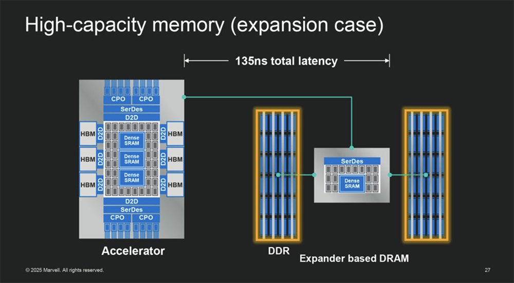 Marvell采用标准DRAM芯片,并为其搭配的加速器优化了定制基片,搭配速率达30Tbps/mm的Marvell下一代D2D IP。