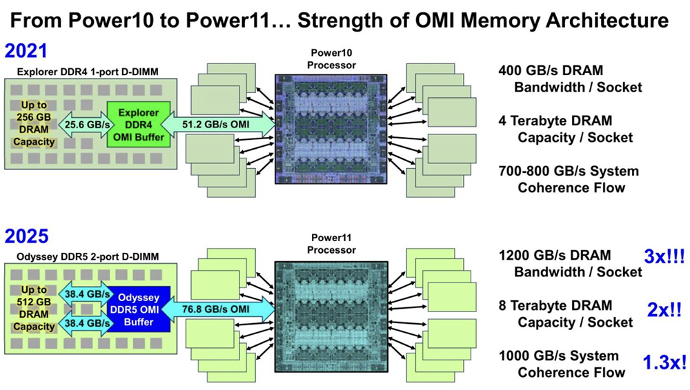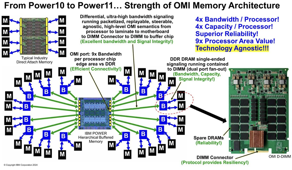Power11升级了内存子系统。IBM称其为OMI内存架构。这种分层内存架构中,一块芯片最多可支持32个DDR5内存端口,传输速度最高达38.4Gbps,最终将带来定制化的内存规格OMI D-DIMM。