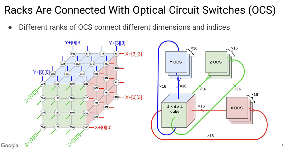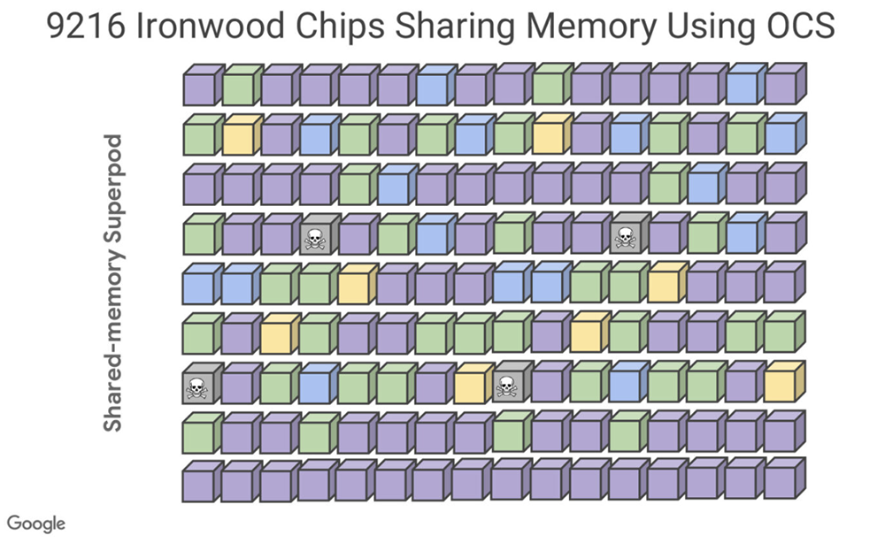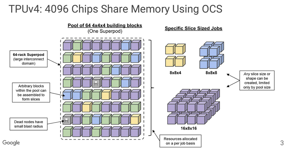 - 单SuperPod节点最多可容纳9216颗芯片,使用OCS(光电路交换机)共享内存