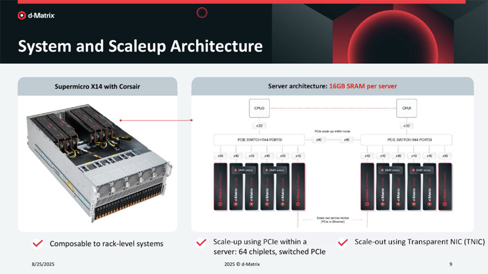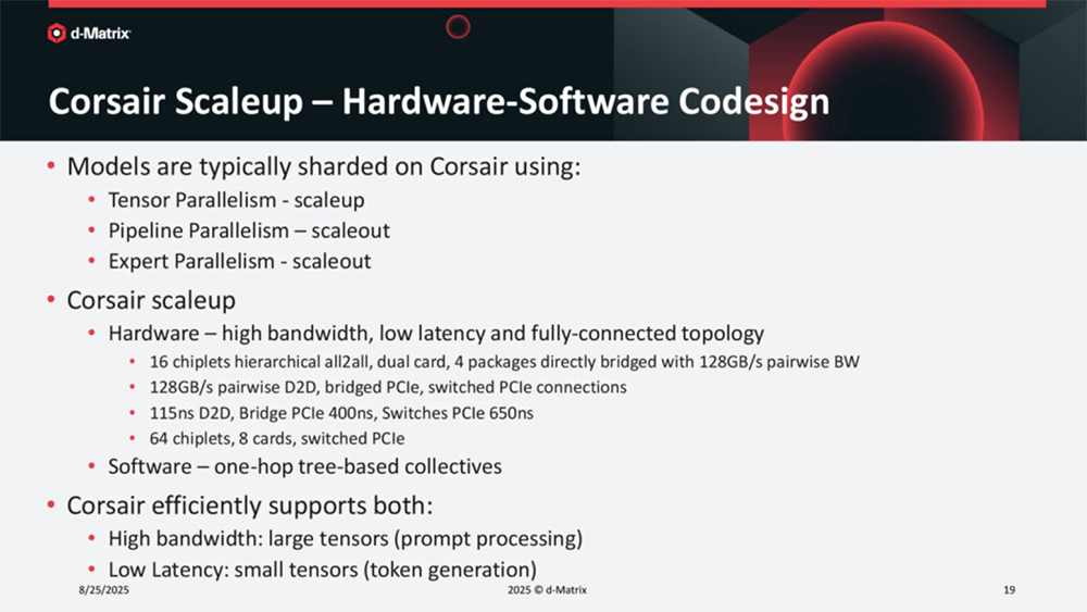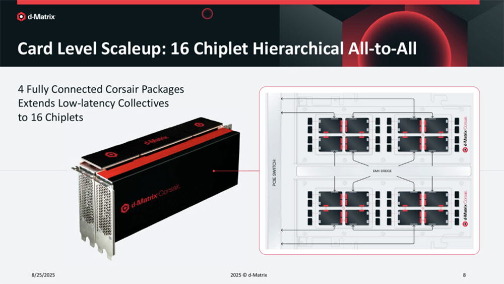 为了实现16个chiplet的All-to-All连接,d-Matrix将D2D延迟降至115ns。即便通过PCIe交换机,其仍然可以将延迟控制在650ns。