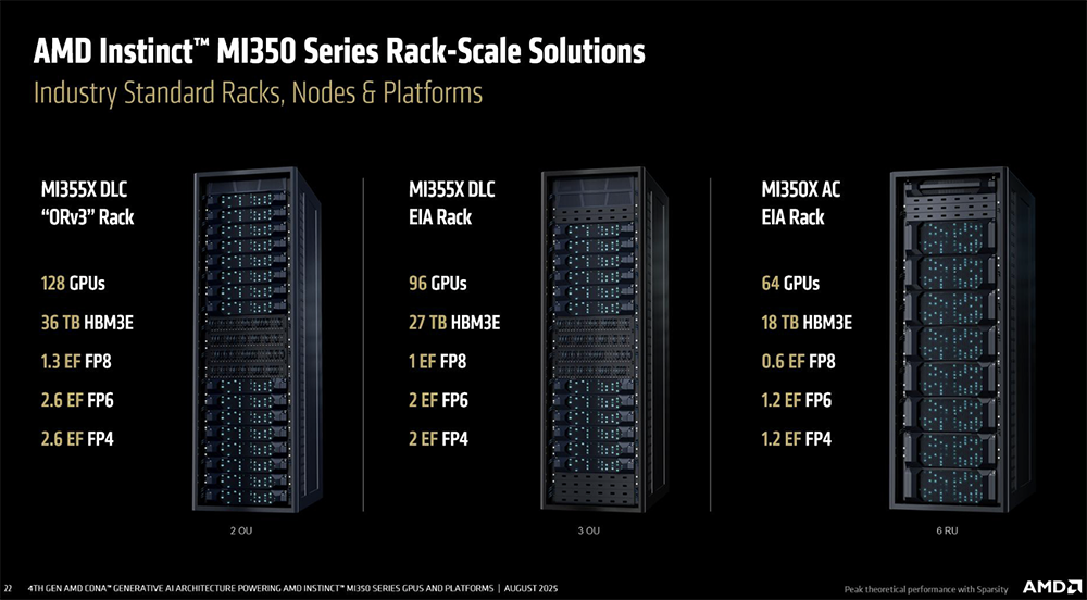AMD提供了一个参考机架解决方案,其中GPU、CPU、横向扩展NIC均来自AMD。对于超大规模计算平台,每个液冷机架最多可配置96或128张MI350系列GPU,每个风冷机架最多可配置64张GPU。