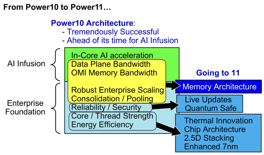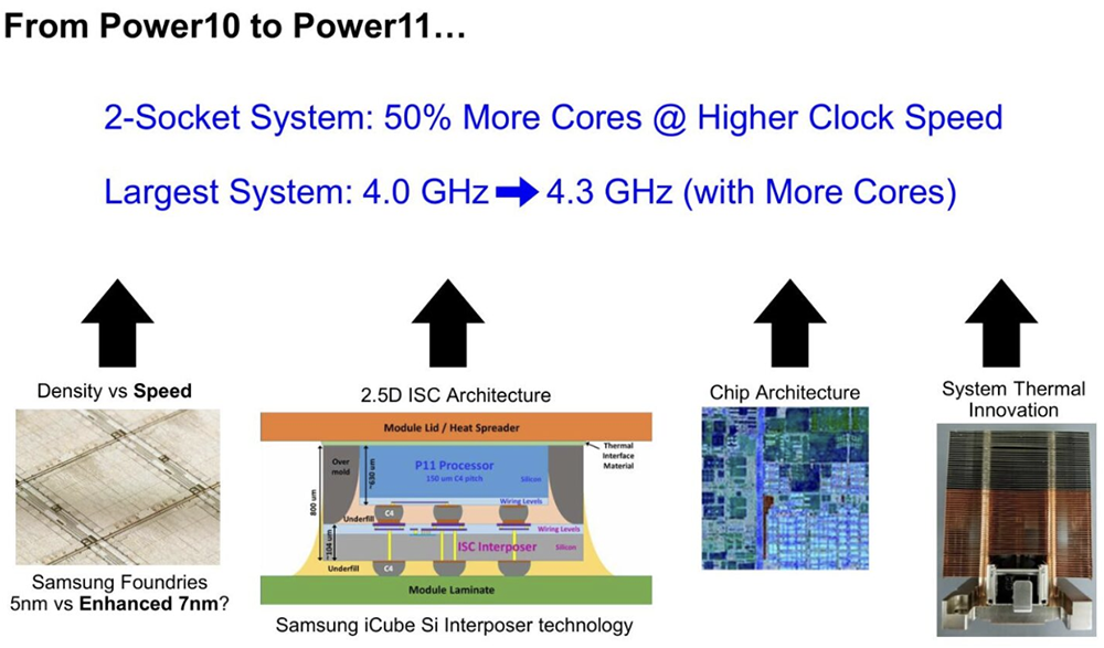 Hot Chips演讲的重点是新一代Power微处理器Power11。Power10将AI Infusion集成到了CPU核心中,但这还不够。Power11采用新版三星7nm工艺,除了进行少量核心架构变更外,还专注于整个系统设计。