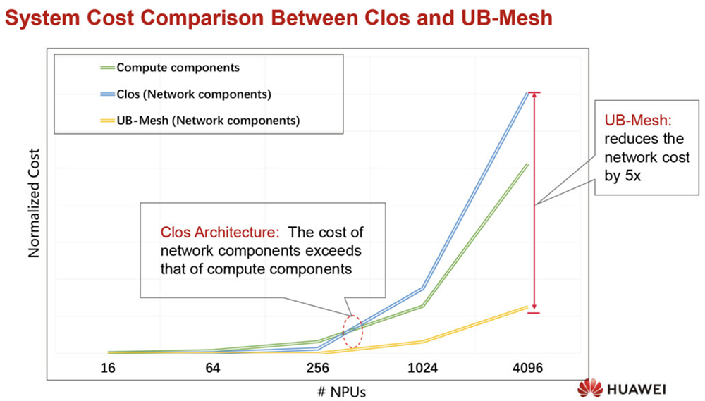 随着网络规模的扩大,传统网络的成本会呈超线性增长。而UB-Mesh的成本呈亚线性增长,仅在计算节点数量大幅增加时才会适度增加。