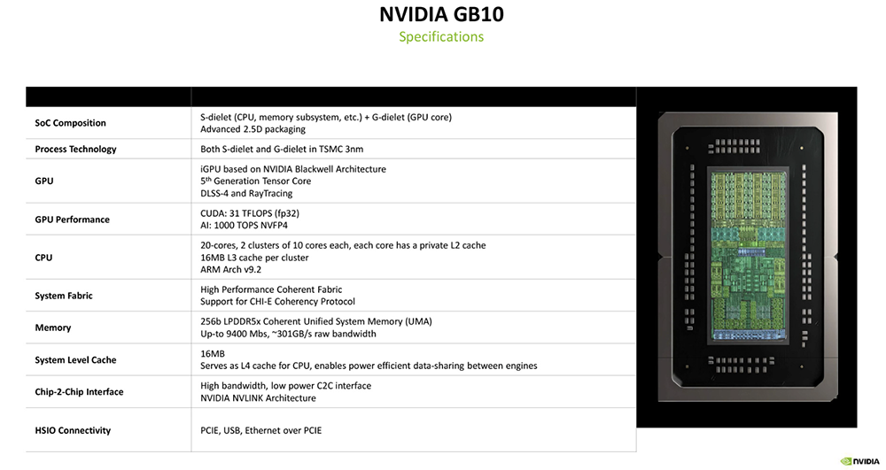 GB10集成了英伟达Blackwell GPU和由联发科打造的20核Arm CPU,采用台积电3nm工艺、2.5D先进封装。