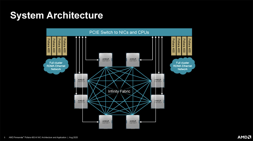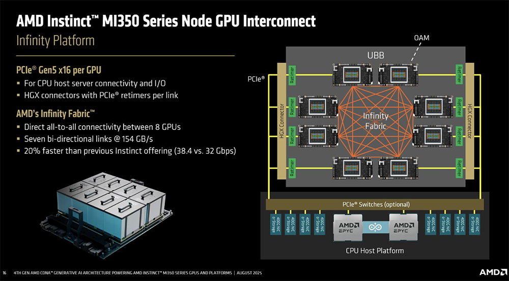 多插槽系统支持在单基板上部署多达8张GPU。PCIe Gen5用于连接主机CPU和网卡,AMD Infinity Fabric用于GPU之间的All-to-All直连。