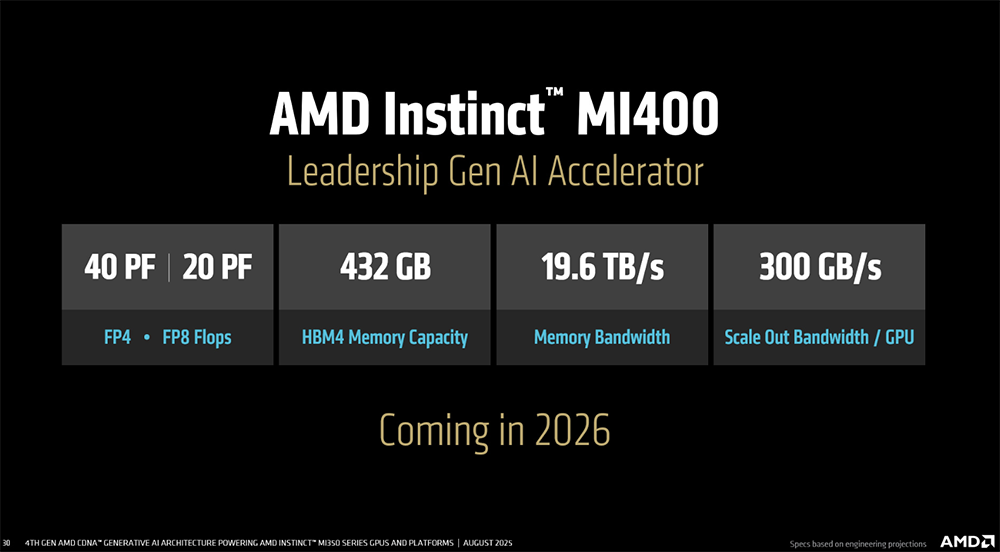 将于明年发布的MI400系列,将用上搭载432GB HBM4,性能提升幅度更猛。