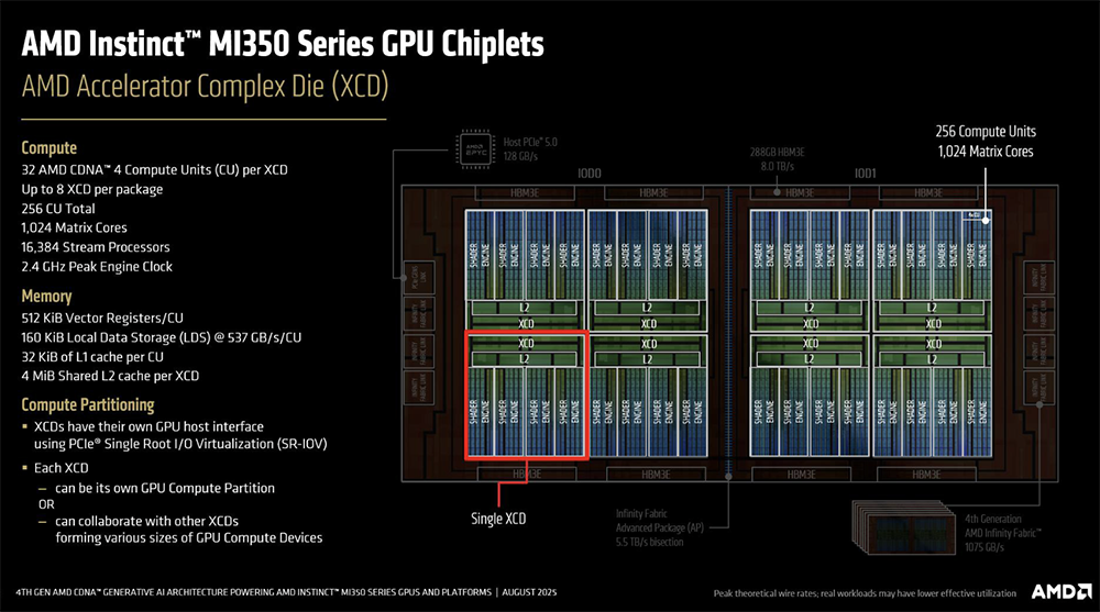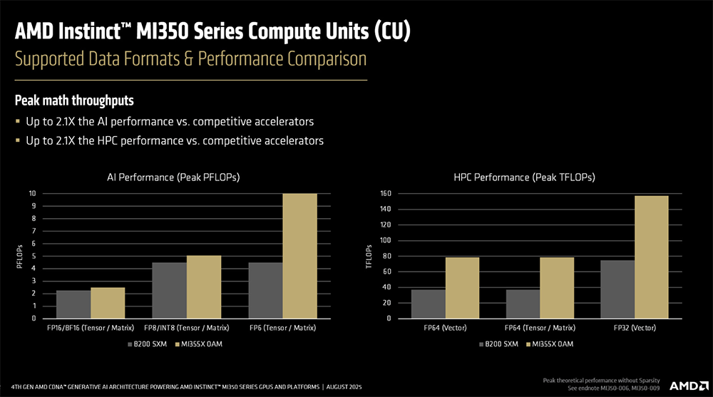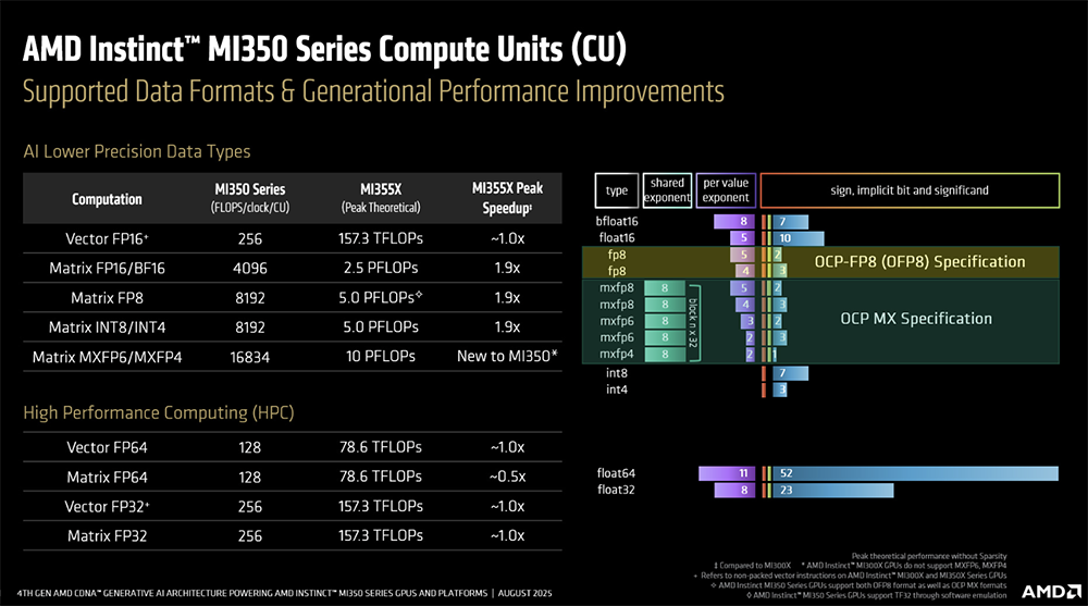 CDNA 4架构使多种数据类型的吞吐量几乎翻倍,并引入了对MXFP6和MXFP4数据格式的硬件支持。