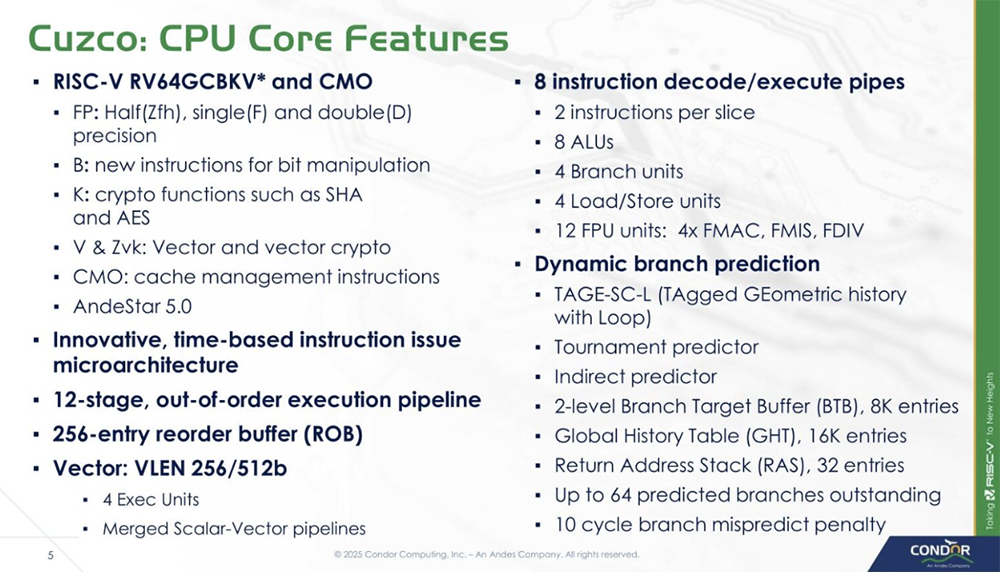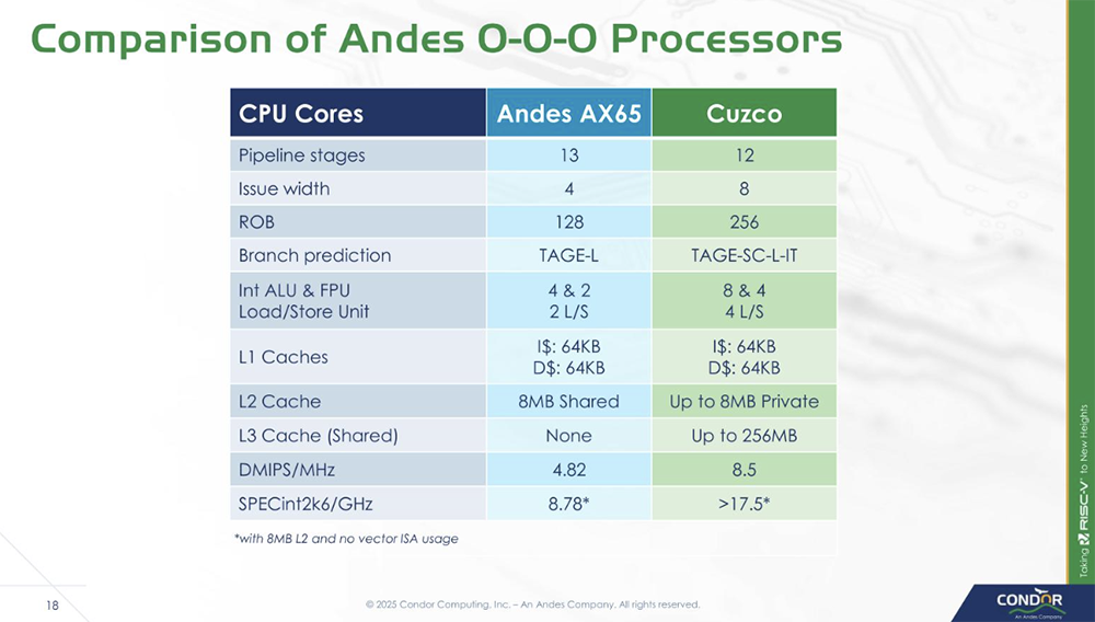 Cuzco的设计在SPECint2006中每时钟的性能,几乎是晶心科技当前AX65核心的两倍。