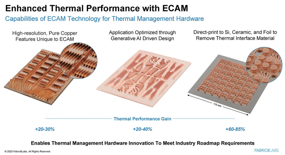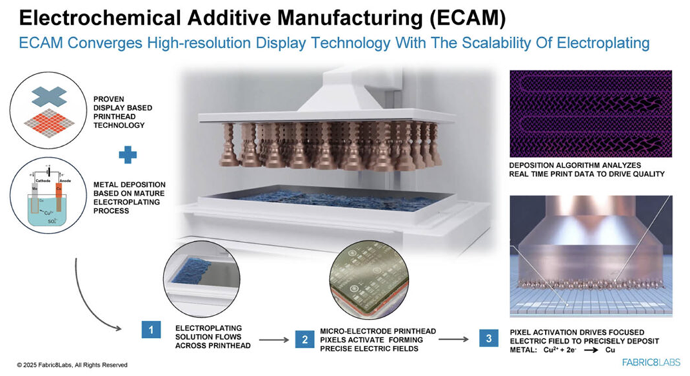 Fabric8Labs方案本质上是一块OLED显示屏,用电荷而非光来以像素分辨率沉积铜。这就是电化学增材制造(ECAM),融合了高分辨率显示技术和电镀的可扩展性。有了它,就能制造出更复杂的结构,适应未来的AI散热管理硬件。