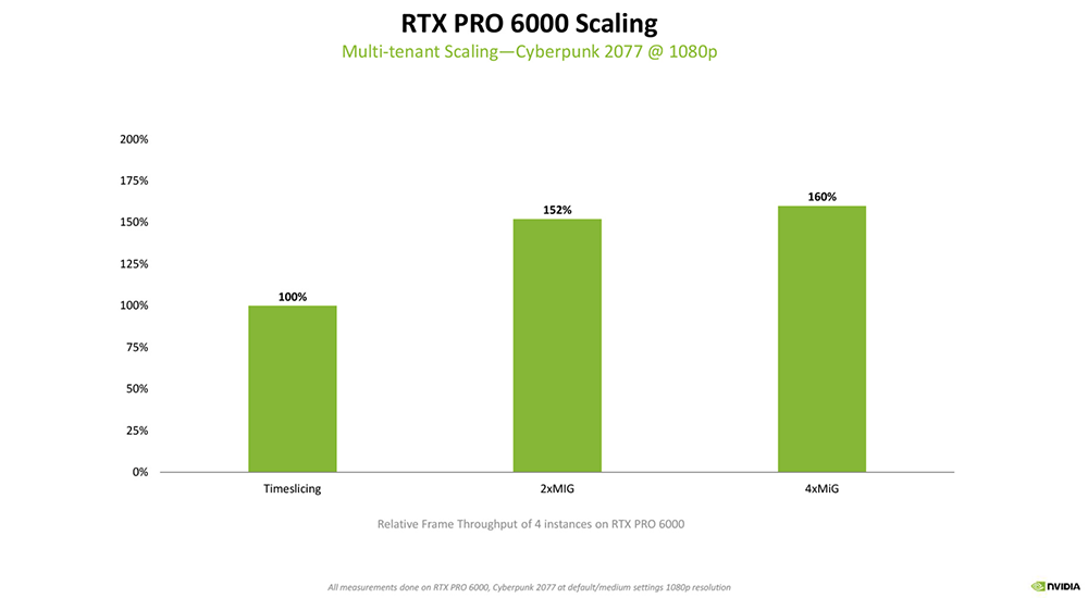单个1080p客户端工作负载过小,无法完全满足RTX Pro 6000的计算需求,将其拆分为多个较小的vGPU后,则能通过并行执行多个工作负载来保持GPU的负载饱和。