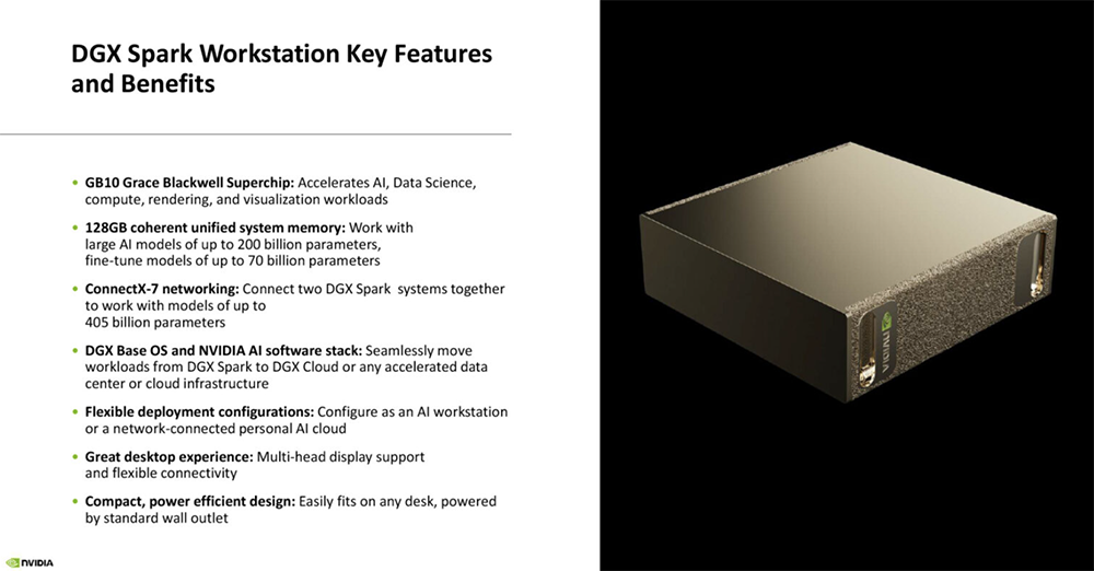 搭载GB10的DGX Spark工作站提供高达4TB的SSD,单台能跑具有2000亿个参数的AI大模型和具有700亿个参数的微调模型。通过ConnectX-7 NIC还能将两个DGX Spark连在一起,以支持更大的模型。