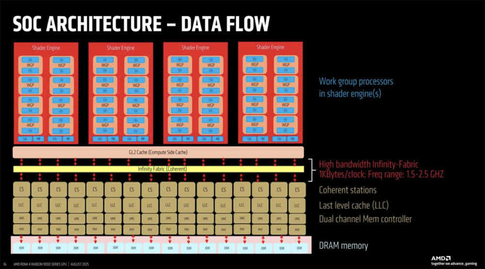 在SoC架构中,AMD展示了数据在着色器引擎、各种缓存和内存控制器之间的流动方式。Infinity Fabric的带宽高达1KB/时钟频率。