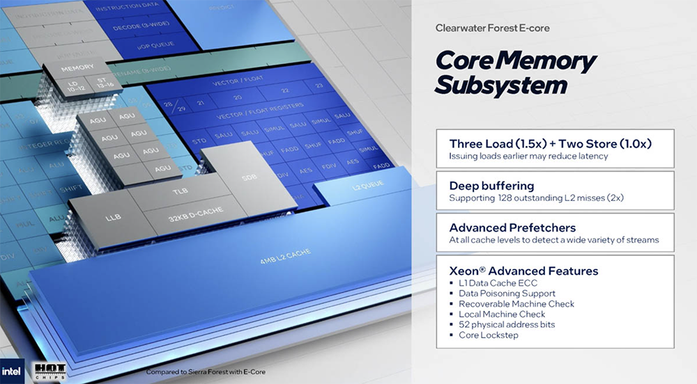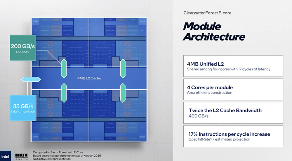 单个Clearwater Forest模块拥有4个核心,共享4MB统一L2缓存。L2缓存带宽相较前代翻倍,达到400GB/s。