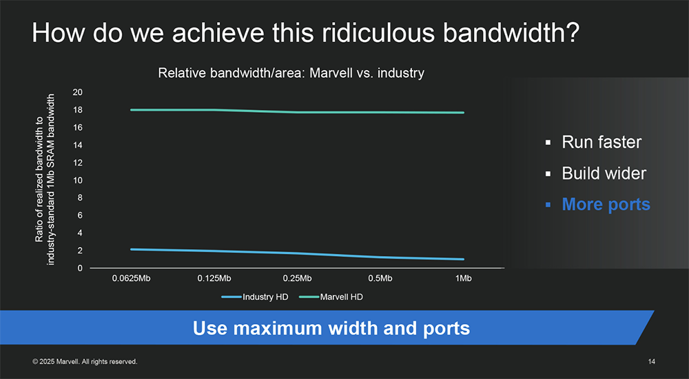 怎么做到的?主要有三种方法:运行速度更快,SRAM单元做得更宽,增加更多端口。即便用大型1Mbit SRAM阵列,Marvell也能实现高带宽密度。
