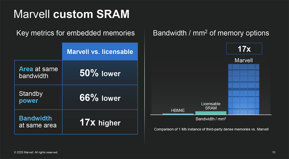 在相同工艺尺寸下,其定制高密度SRAM的带宽密度是标准SRAM的17倍,所需面积减少50%,待机功耗减少66%。
