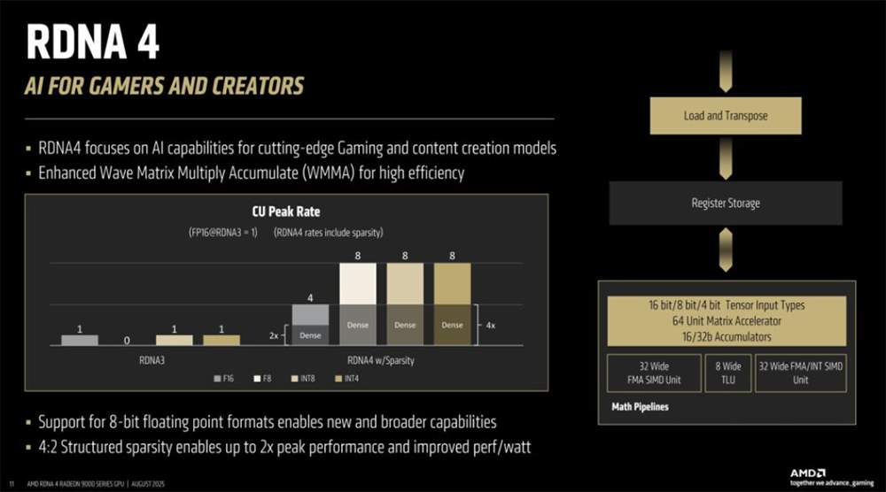 针对ML/AI工作负载,RDNA 4增加了FP8及稀疏化功能。