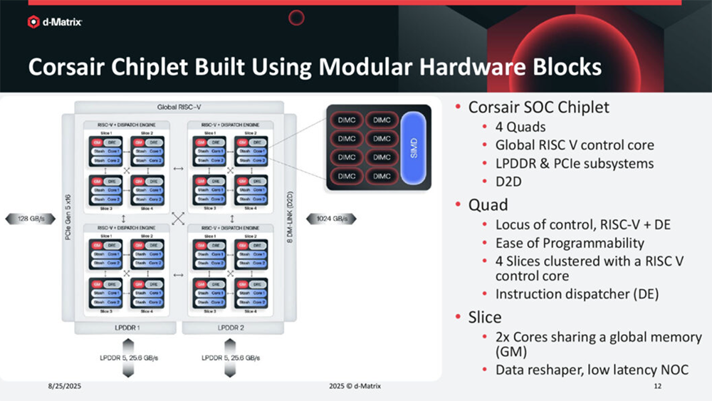 这一架构在每个Chiplet上实现了高内存和高计算密度。每个Chiplet由4个Quad组成,每个Quad包含4个Slice、1个RISC-V控制核心和1个调度引擎。每个Slice包含DIMC核心、SIMD核心和1个数据重塑引擎。