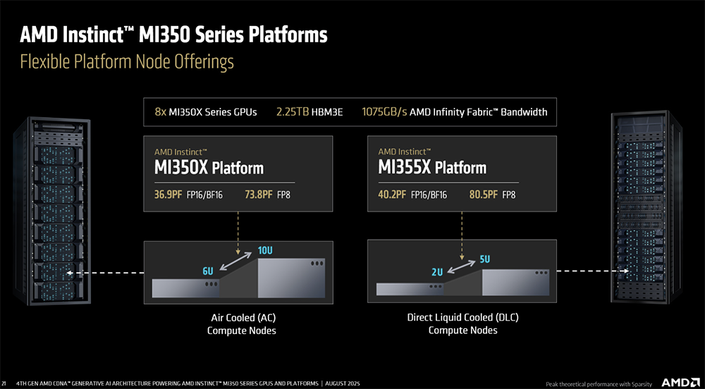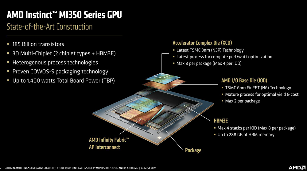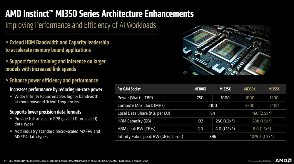 MI350系列支持标准OAM封装。MI350X用于风冷系统,MI355X用于液冷系统,液冷系统总板功耗为1400W。