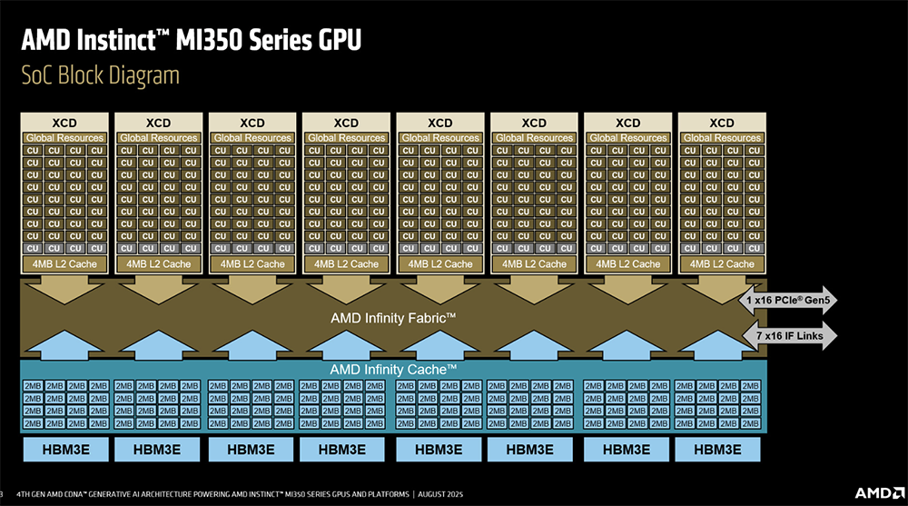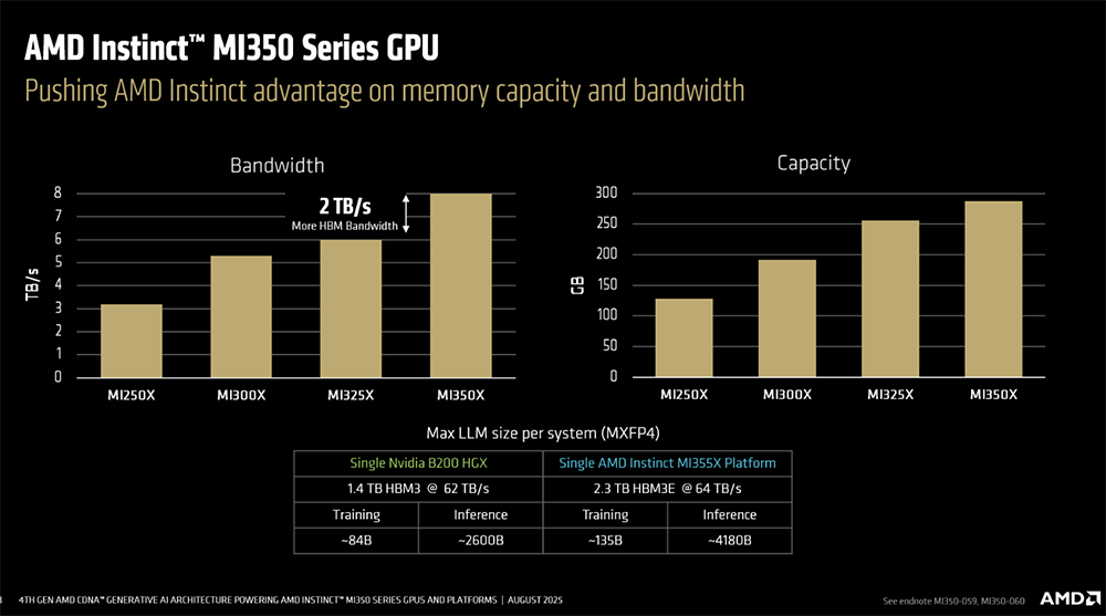 MI350系列提供的HBM带宽比上一代多2TB/s,内存容量也更大,可减少所需的GPU数量。