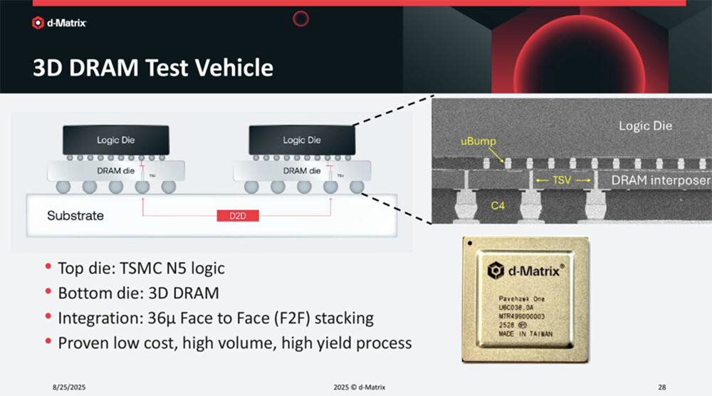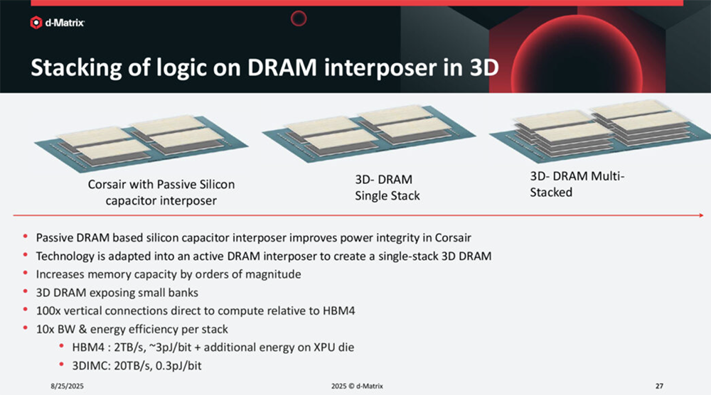 为了进一步突破内存瓶颈,d-Matrix将先进的3D堆叠数字存内计算3DIMC集成到下一代架构Raptor中,通过垂直堆叠内存并与计算芯片紧密集成,使AI工作负载的内存带宽和容量提升几个数量级。