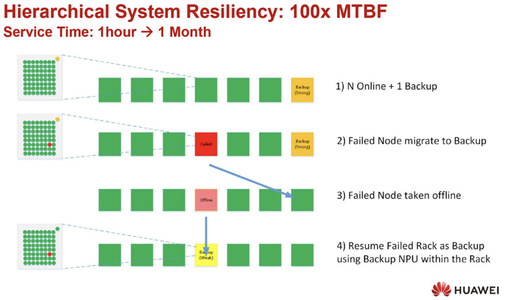 华为的目标是将多业务吞吐量(MBTF)提升100倍。实现方法之一是提供热备机架,以便在节点发生故障时接管。故障机架修复后,会作为新的热备机架返回节点。如果机架带有额外的芯片,那么它本身就具有一定的弹性,可以作为弱热备机架返回。