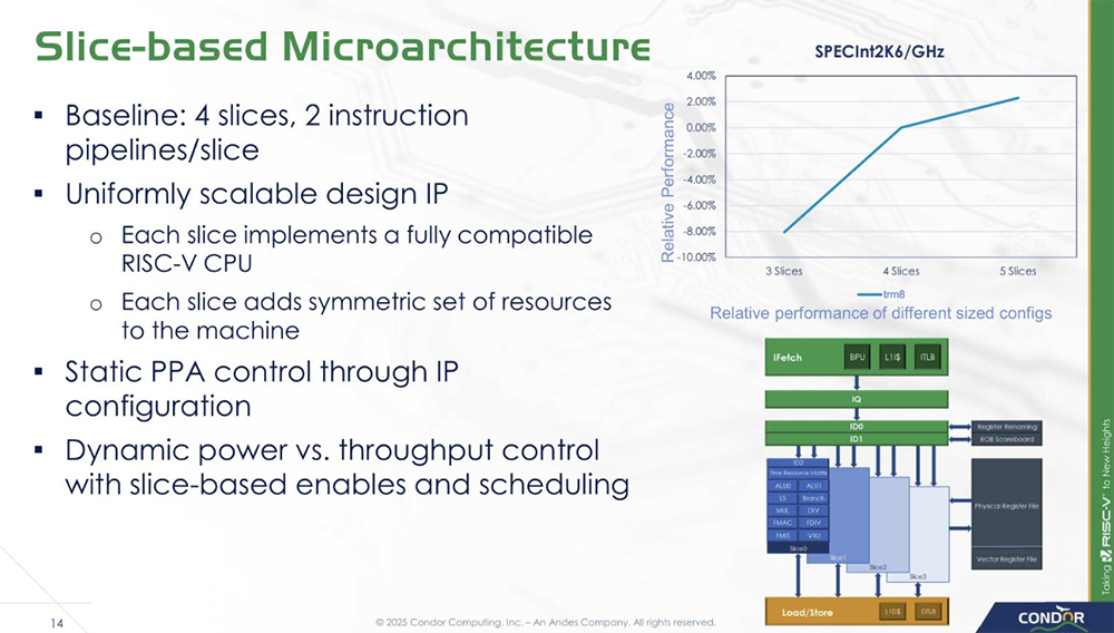 Cuzco采用基于slice的CPU设计,总共最多8个核心,具有私有的L2和共享的L3。每个slice实现一个完全兼容的RISC-V CPU,向机器添加一组对称的资源。