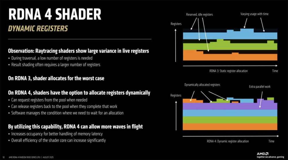 RDNA 4还通过动态寄存器分配对着色器引擎进行了一些更新,从而增加传播波数。